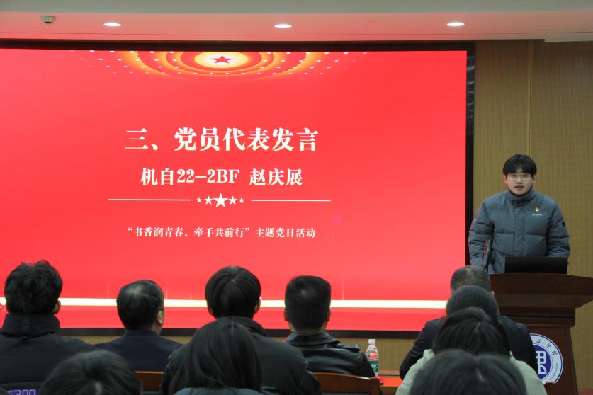 机械工程学院学生第一党支部组织委员赵庆展作为党员代表发言。他对机关第十四党支部的深情厚谊与慷慨赠书表示衷心感谢,并将以此次赠书活动为契机,自觉践行“读好书、好读书、善读书”的理念,让书香浸润青春岁月,努力成为优秀的新时代党员。