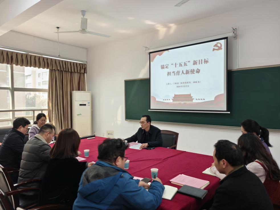 为深入学习贯彻党的二十届四中全会精神,全面落实“十五五”规划部署,推进“七进两联系”工作走深走实,3月12日下午,我院在16301B会议室举行专题党课。党课以“锚定‘十五五’新目标,担当育人新使命”为主题,由校党委委员、副校长丁跃浇主讲,学院党委书记徐丹主持,学院党委班子成员及部分师生党员代表参加。