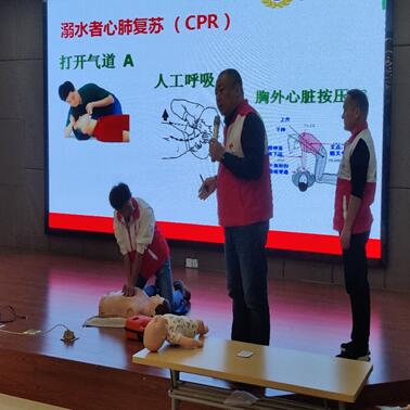 宣讲中,徐湘平简要介绍了红十字会的历史和人道主义援助事迹,提出了省内紧急救护知识普及率低下的问题。他强调了紧急救护知识的重要性并详细解释了从流鼻血怎样止血到冠心病、脑卒中、代谢紊乱综合征等疾病的特征、发病症状以及如何及早干预和急救的方法。在活动接近尾声时,徐湘平还组织学生学习使用AED来进行模拟心肺复苏。