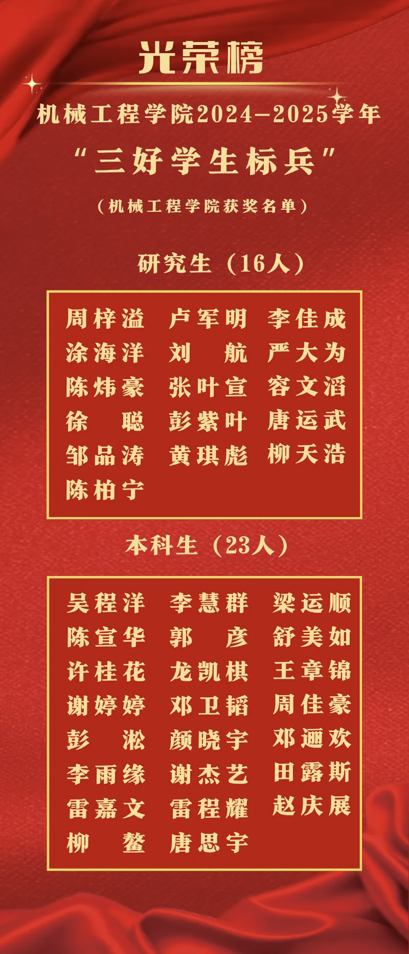 “三好学生”这份荣誉,是对“品德优、学业精、体魄健”的极致认可;而“三好学生标兵”,更是其中的标杆人物——他们思想有高度、品行有温度、协作有力度、成绩有亮度,是同学们成长路上最鲜活的“参照系”。现在,机械君就带大家走进2024-2025年度机械工程学院的三好学生标兵与三好学生群体!