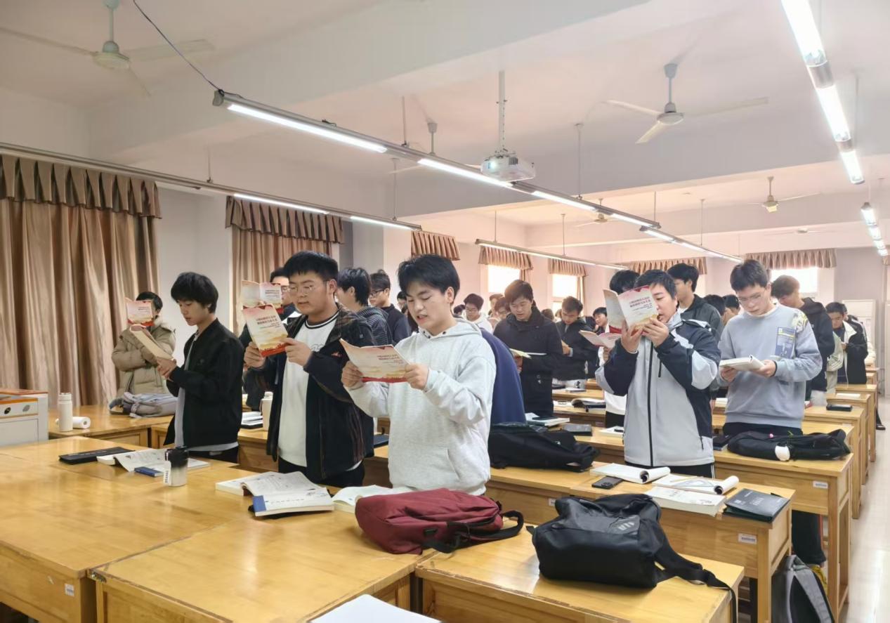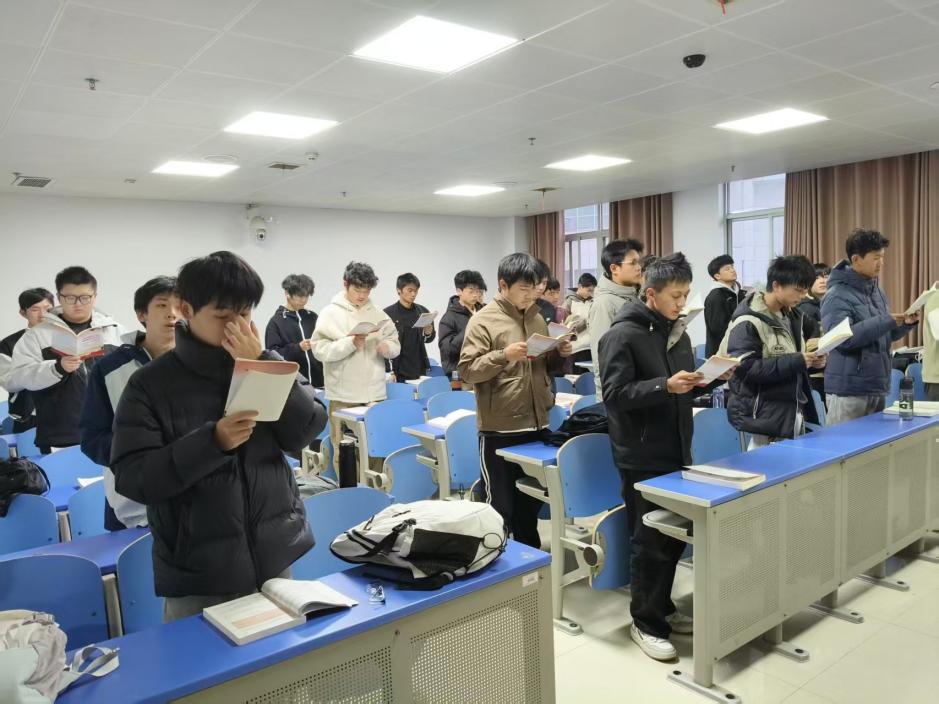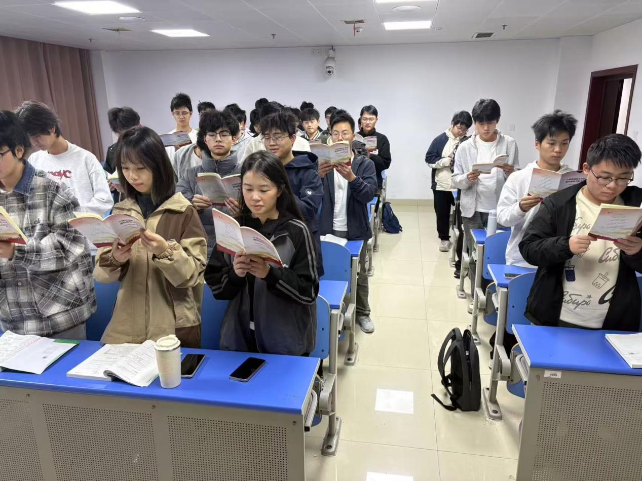 活动以班级为单位推进,由班长与团支书协同安排,于每周一至周五的上午和下午第一节课前各进行三分钟诵读。授课教师不仅给予大力支持,更亲身加入诵读行列,与学生共同参与。在老师的引领下,同学们神情专注,以饱满的热情诵读红色经典,整个校园洋溢着浓厚的爱国氛围,展现出蓬勃的青春朝气。