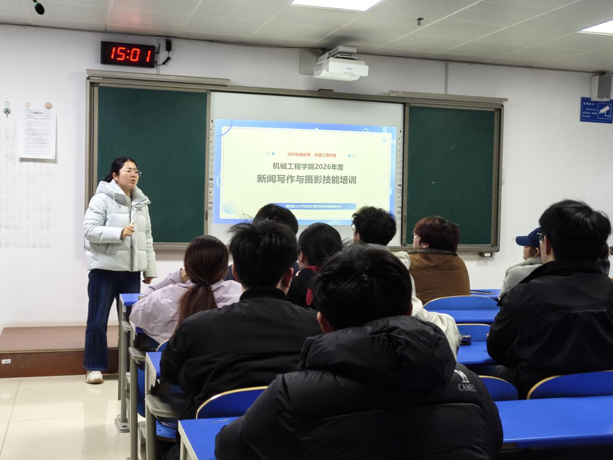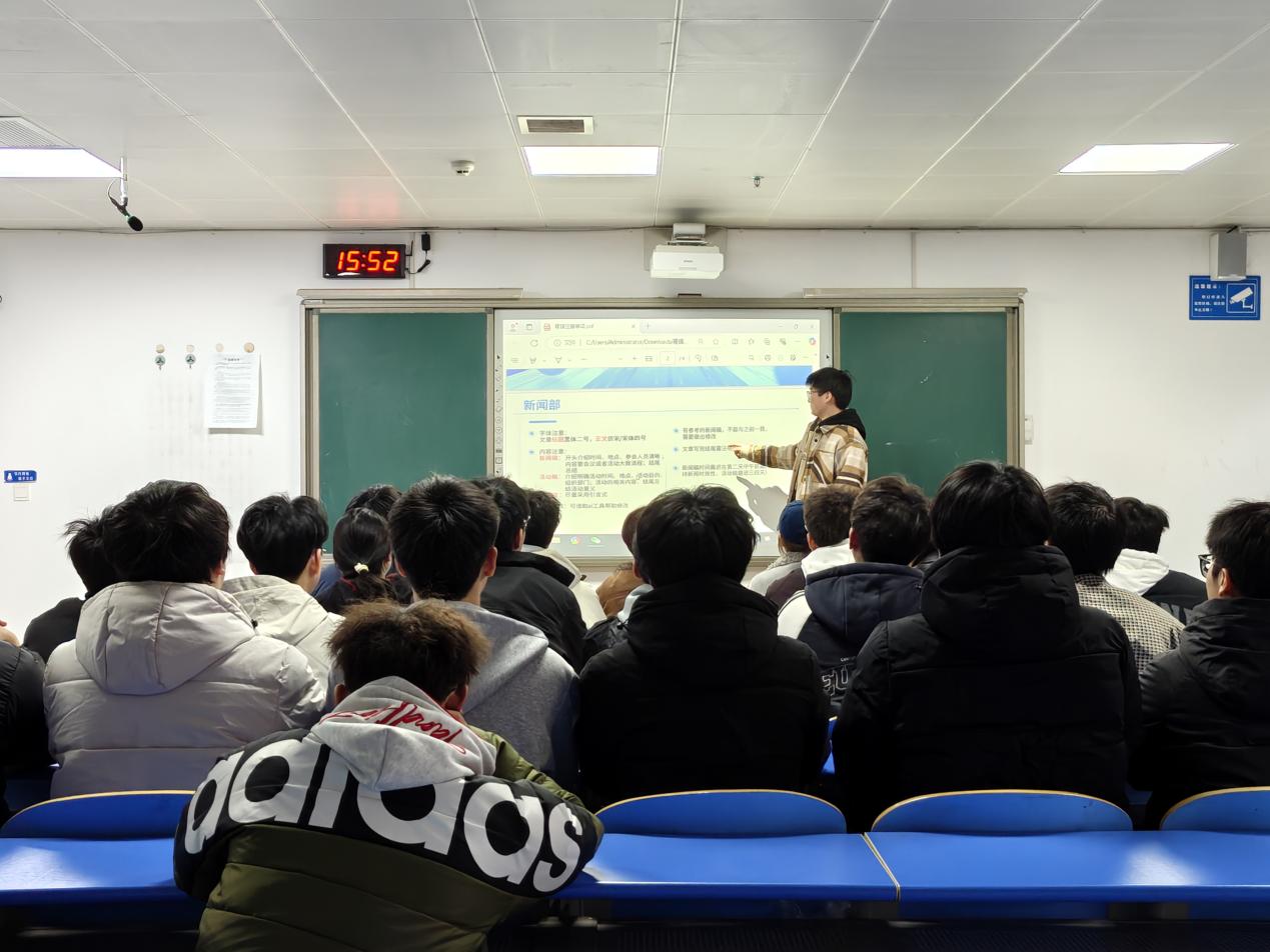 为进一步提升学院宣传队伍的专业素养,规范新闻宣传工作流程,增强校园宣传内容的传播力与影响力,3月10日15:00我院青年新媒体中心(以下简称青媒)在12108教室开展2026年春季学期新闻写作与摄影技能专题培训。本次培训由学院宣传专干王荣荣老师担任主讲,青媒主席汪俊杰主持,青媒全体成员参与。