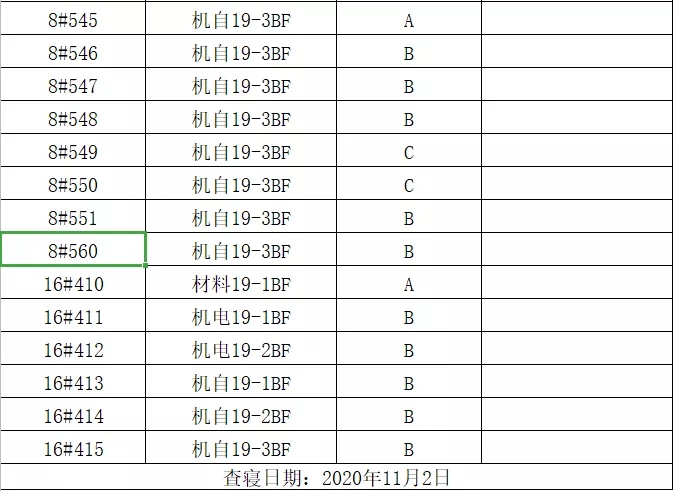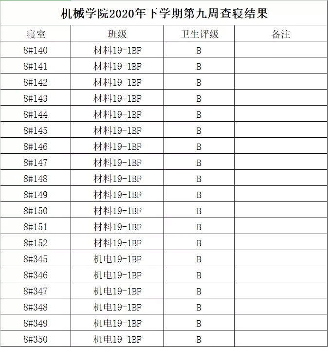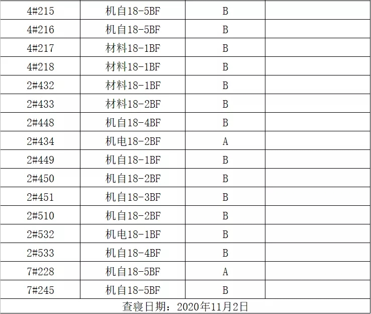 为维护学院正常的教学、生活秩序,同时给同学们提供一个优良的学习环境及干净、舒适的寝室环境。本周一(11月2日)20:00,由机械工程学院团总支学生分会生活部、权安部与2020级各班生活委员组成检查小组,对我院2020、2019、2018级学生寝室进行了检查。检查的主要内容有:寝室卫生、物品摆放情况,违规电器的使用情况及寝室文化建设。 本次查寝共查寝室245间,其中优秀寝室10间,良好195间,合格40间,不合格0间,寝室无人14间。现将寝室检查结果公布如下: 优秀寝室展示: